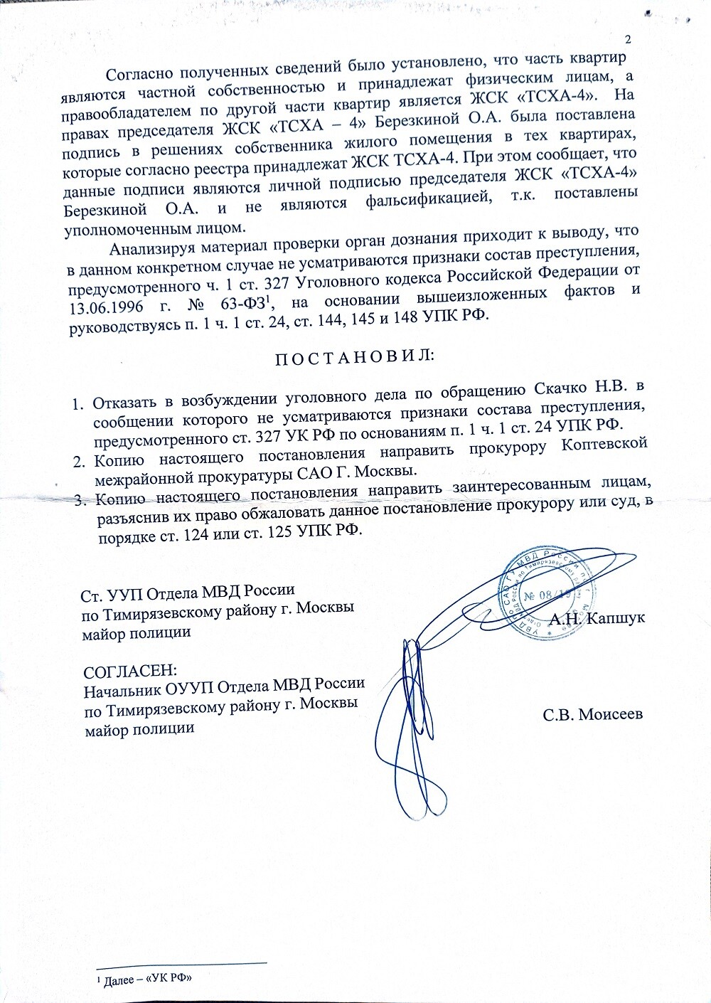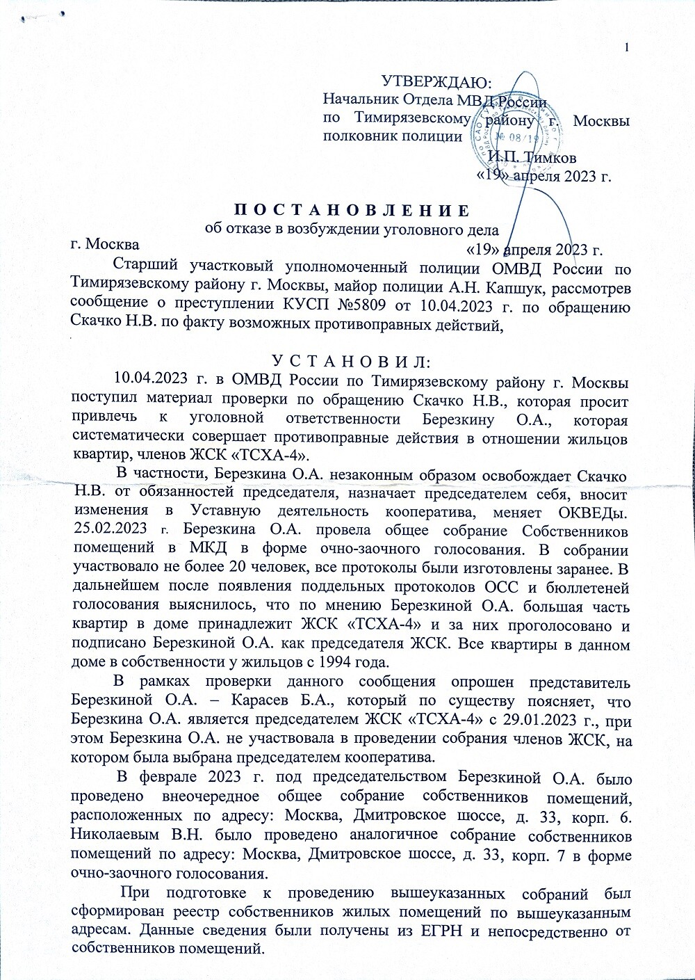 Постановление от 19.04.2023г. об отказе в возбуждении уголовного дела по сообщению гр. Скачко Н.В. в отношении Председателя правления ЖСК "ТСХА-4"